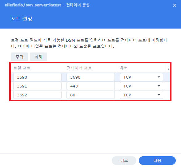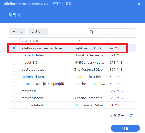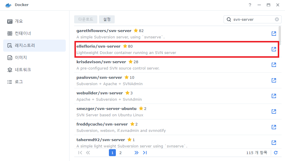 1. 레지스트리에서 elleflorio/svn-server를 다운받습니다.(버전은 latest로 받겠습니다.)